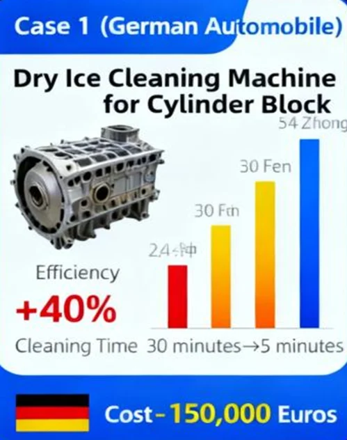 ·Solution: Provide a fully automatic dry ice cleaning machine equipped with a customized cleaning tooling, enabling batch cleaning of cylinder blocks. The cleaning time per piece is reduced from 30 minutes to 5 minutes, with no residues after cleaning, and the cylinder block precision meets the standards.