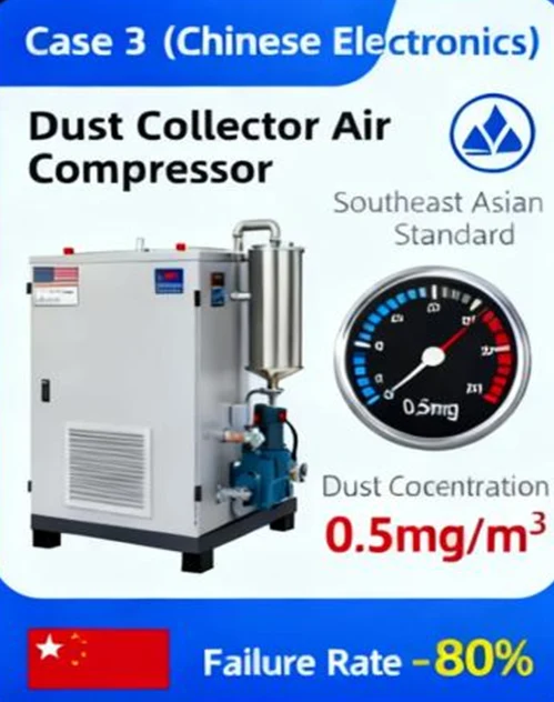 ·Solution: Provide anti-static industrial dust collectors and oil-free air compressors adapted to 220V voltage. The dust collector has a filtration efficiency of 99.95%, and the oil content of the air compressor is less than 0.01mg/m³.