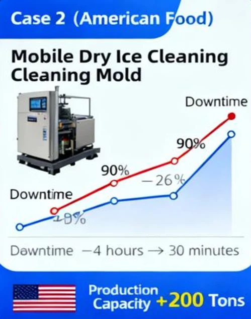 ·Solution: Configure a mobile dry ice cleaning machine for online cleaning of molds without disassembly. Each cleaning cycle is shortened to 30 minutes, and food-grade dry ice is used with no residues.